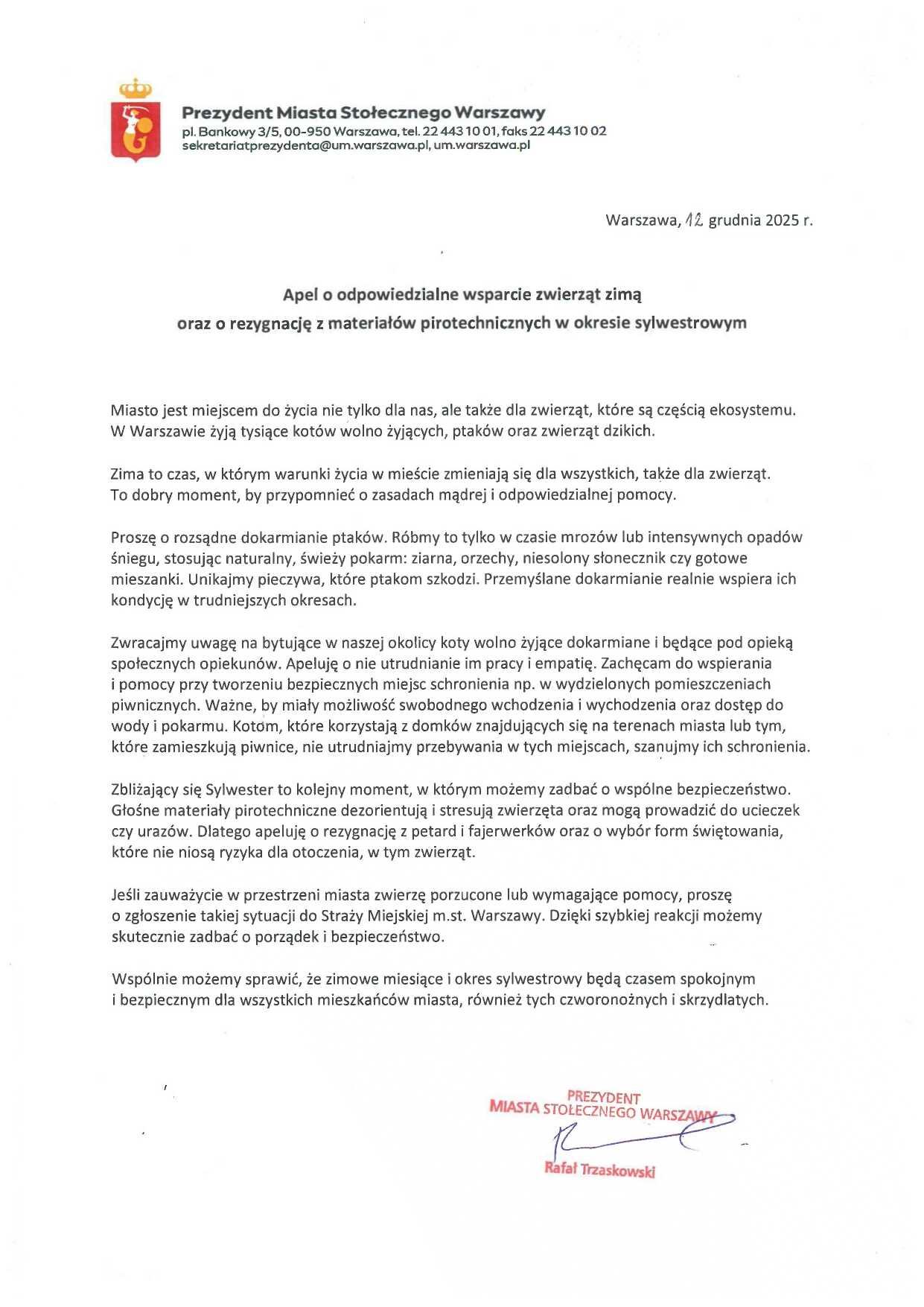 „Wspólnie możemy sprawić, że zimowe miesiące i okres sylwestrowy będą czasem spokojnym i bezpiecznym dla wszystkich mieszkańców miasta, również tych czworonożnych i skrzydlatych” – podkreśla Prezydent m.st. Warszawy Rafał Trzaskowski.