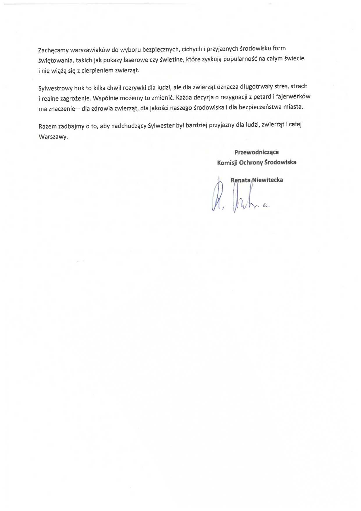 Zbliżający się Sylwester to kolejny moment, w którym możemy zadbać o wspólne bezpieczeństwo. Głośne materiały pirotechniczne dezorientują i stresują zwierzęta oraz mogą prowadzić do ucieczek czy urazów. Dlatego apeluję o rezygnację z petard i fajerwerków oraz o wybór form świętowania, które nie niosą ryzyka dla otoczenia, w tym zwierząt.