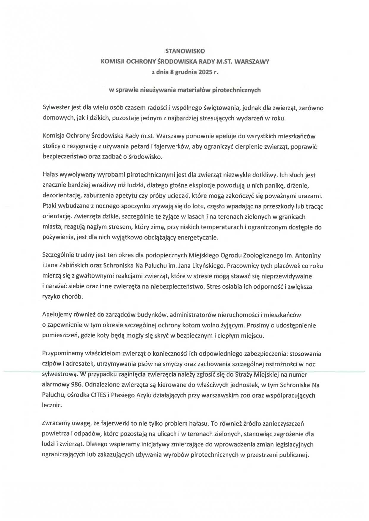 Zwracamy uwagę, że fajerwerki to nie tylko problem hałasu. To również źródło zanieczyszczeń powietrza i odpadów, które pozostają na ulicach i w terenach zielonych, stanowiąc zagrożenie dla ludzi i zwierząt. Dlatego wspieramy inicjatywy zmierzające do wprowadzenia zmian legislacyjnych ograniczających lub zakazujących używania wyrobów pirotechnicznych w przestrzeni publicznej.